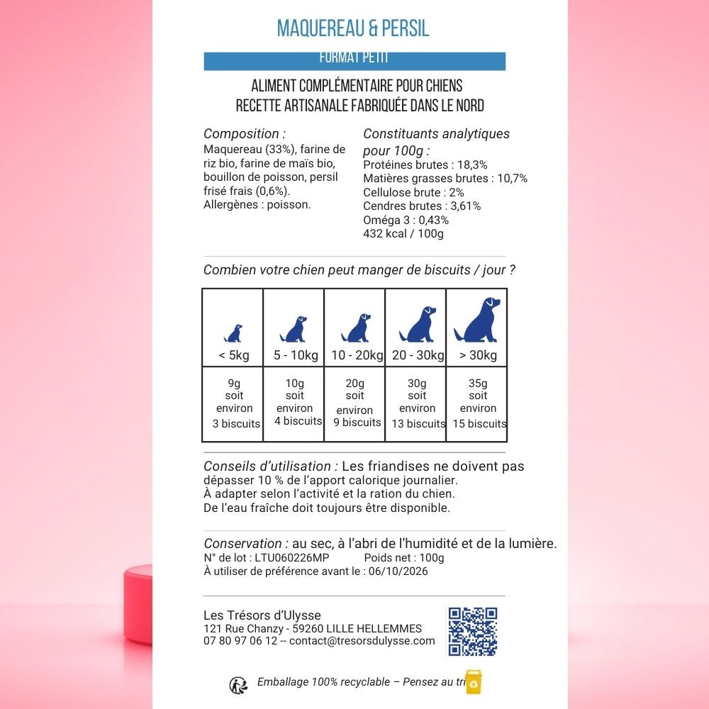 Grâce à l’association du maquereau, poisson riche en nutriments essentiels, et du persil, reconnu pour ses bienfaits digestifs, ces gâteaux pour chien s’intègrent parfaitement dans une alimentation équilibrée, tout en apportant un moment de plaisir quotidien.