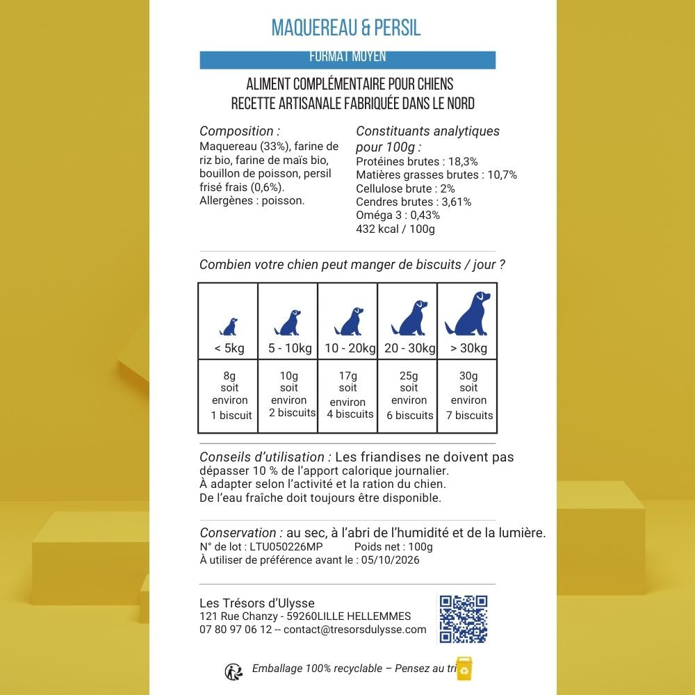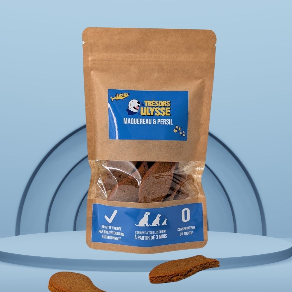 Les gâteaux pour chien naturels et artisanaux au maquereau et persil sont conçus pour allier plaisir gustatif, qualité nutritionnelle et ingrédients soigneusement sélectionnés par notre cooker des Trésors d’Ulysse.