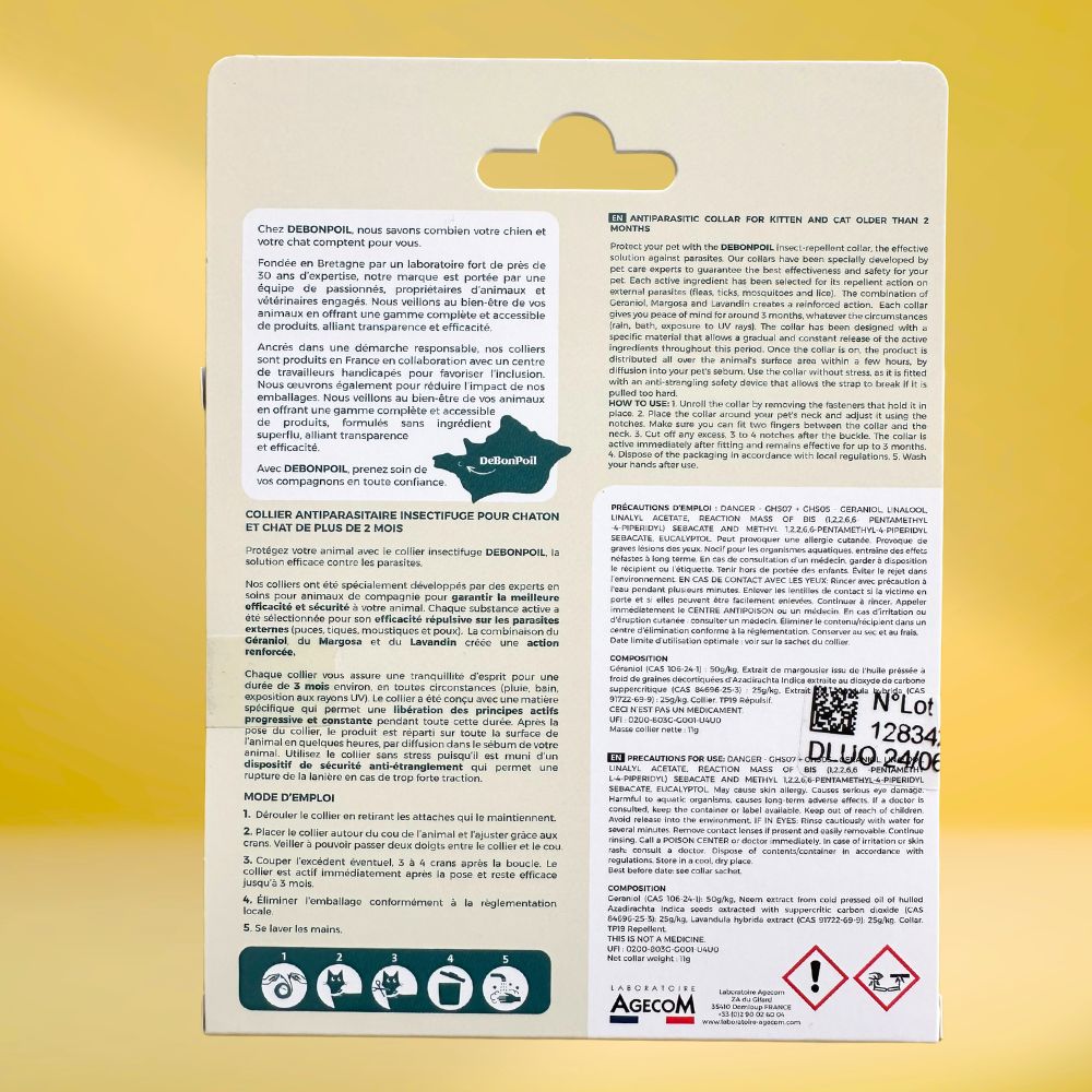 Ce collier est conçu pour être utilisé chez les chatons dès 2 mois, lorsque leur croissance permet le port d’un collier sans danger.